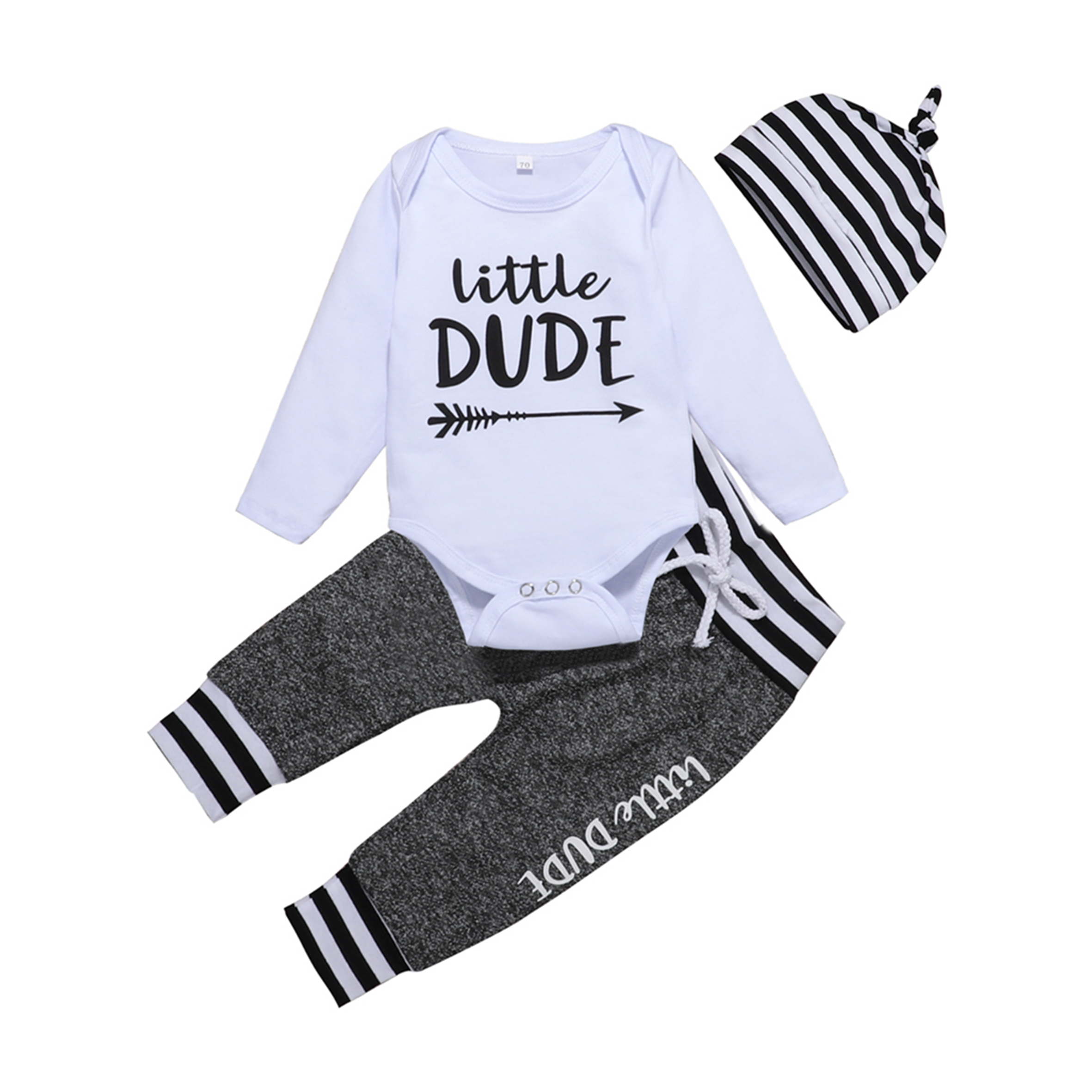 Dress your little gentleman in style with this comfortable 3-piece “Little Dude” clothing set. It includes a long sleeve baby grow, long pants, and a matching beanie hat.
